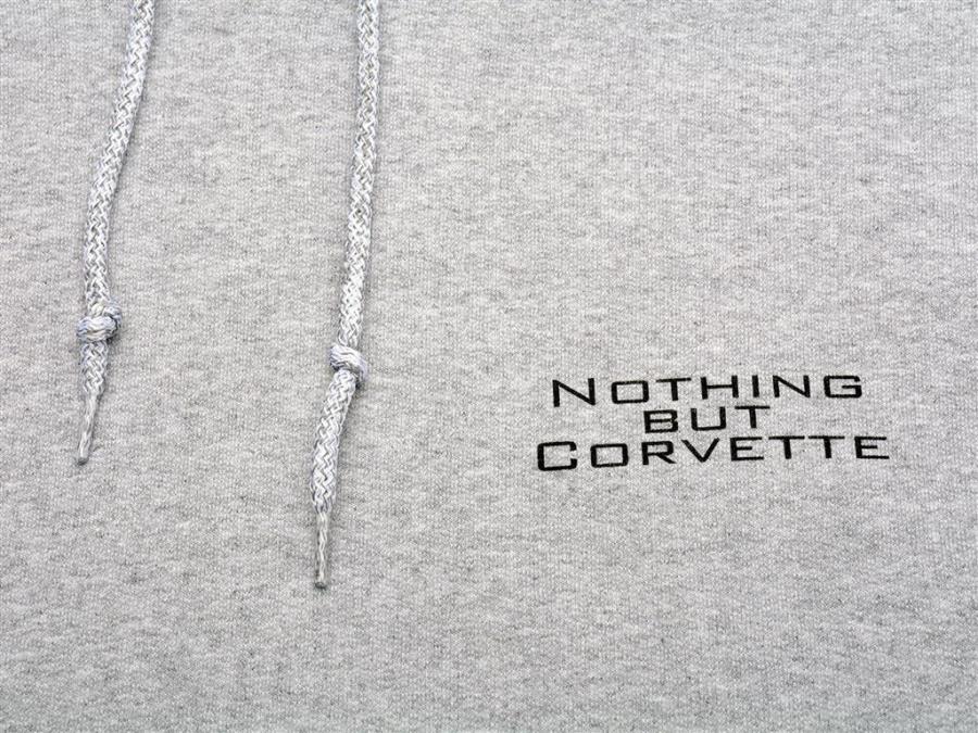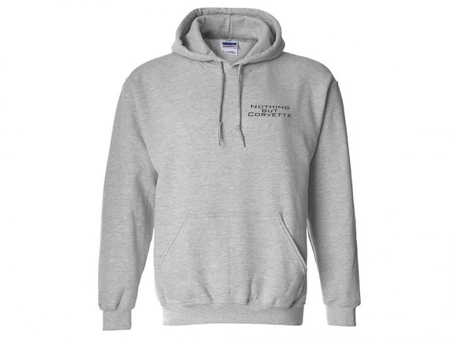 Perfect for the cooler days, this gray hoodie features the C1-C7 Corvettes in a full-color, full-sized graphic on the back. "Nothing But Corvette" is screen printed on the front left chest. A valuable addition to your Corvette wardrobe!