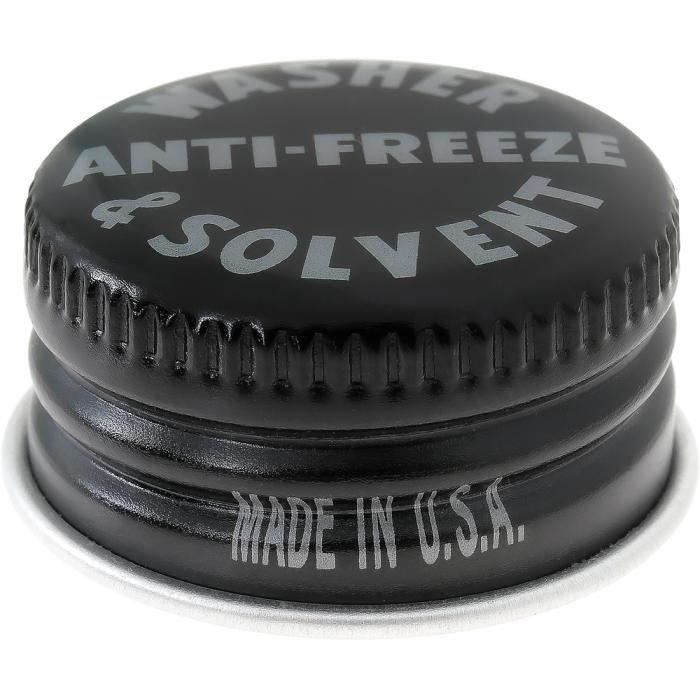 Replacement metal cap with antifreeze/washer solvent lettering as original. This cap is designed to fit on the "Optikleen" glass windshield washer bottle that was found on many of the GM vehicles from 1959-67, including Cadillac, Chevrolet, Buick, Oldsmobile, and Pontiac models.