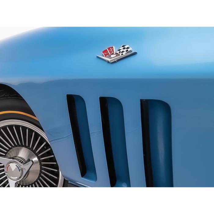 Reproduction crossed flags front fender emblem for 1963-66 Chevrolet Corvette. Each emblem is manufactured in die-cast zinc replicating the original in design, appearance and fitment. Features correct crossed flag coloration for an authentic replacement. Sold individually. Fits all models except 283ci engine equipped models.