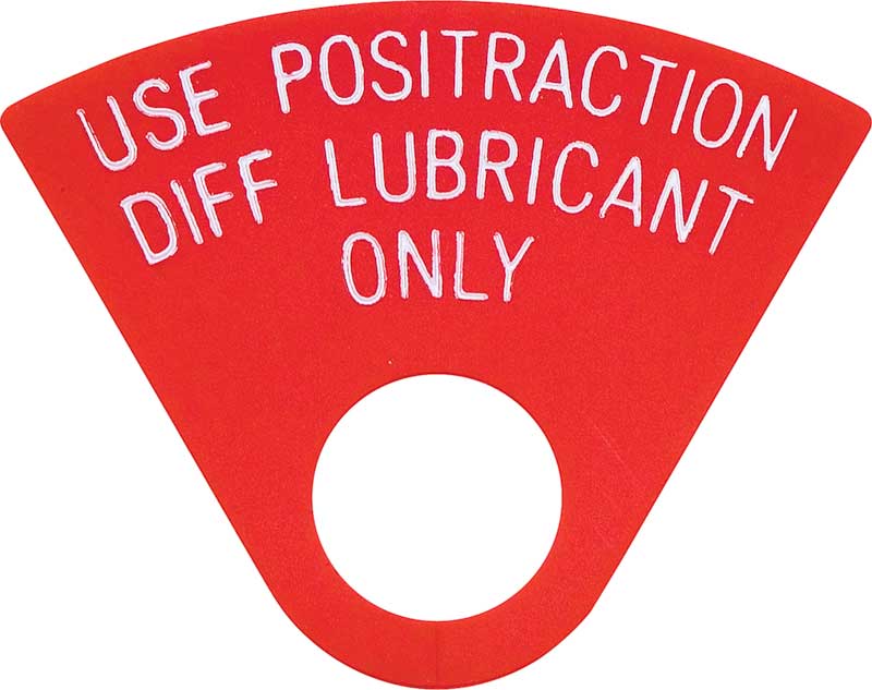 Reproduction of the original rear end positraction tag designed for use on various Buick, Chevrolet, Oldsmobile, and Pontiac models with 12 bolt positraction differentials. Each tag is manufactured in molded plastic to GM specifications in embossed lettering and features the verbiage "USE POSITRACTION DIFF LUBRICANT ONLY" in the correct font for authenticity. The tag mounts with the fill plug. For use on various makes and models.