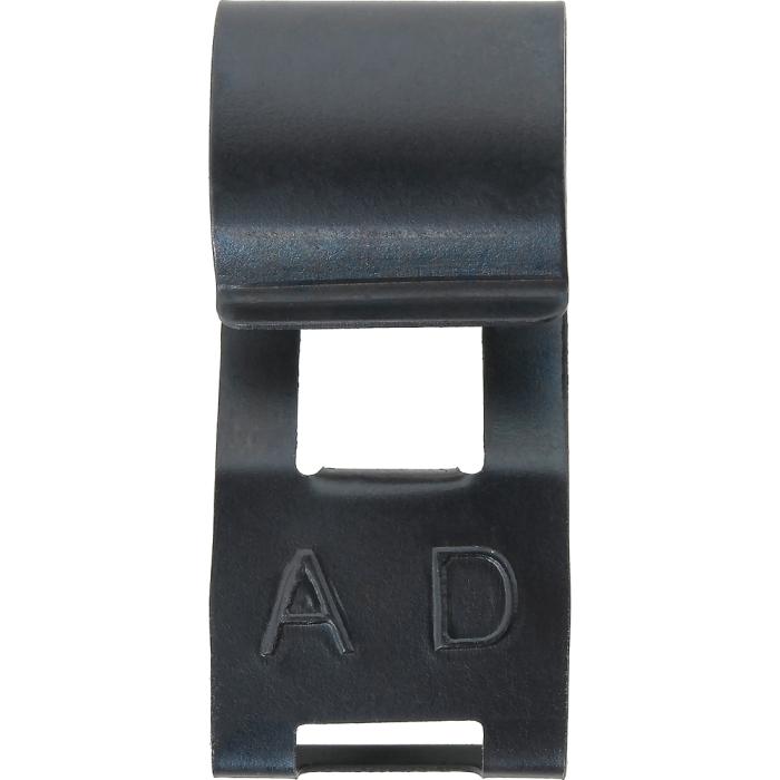 Reproduction radiator overflow hose retainer clip for various 1967-81 Chevrolet, Buick, Oldsmobile, and Pontiac models. Each retainer clip is manufactured to factory specifications from spring steel, replicating the original appearance and design. Mounts on the passenger side radiator tank and helps hold the overflow hose securely in place. Features the correct "AD" stamping.
