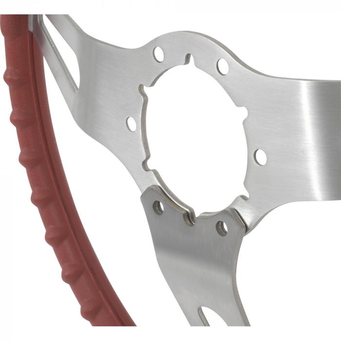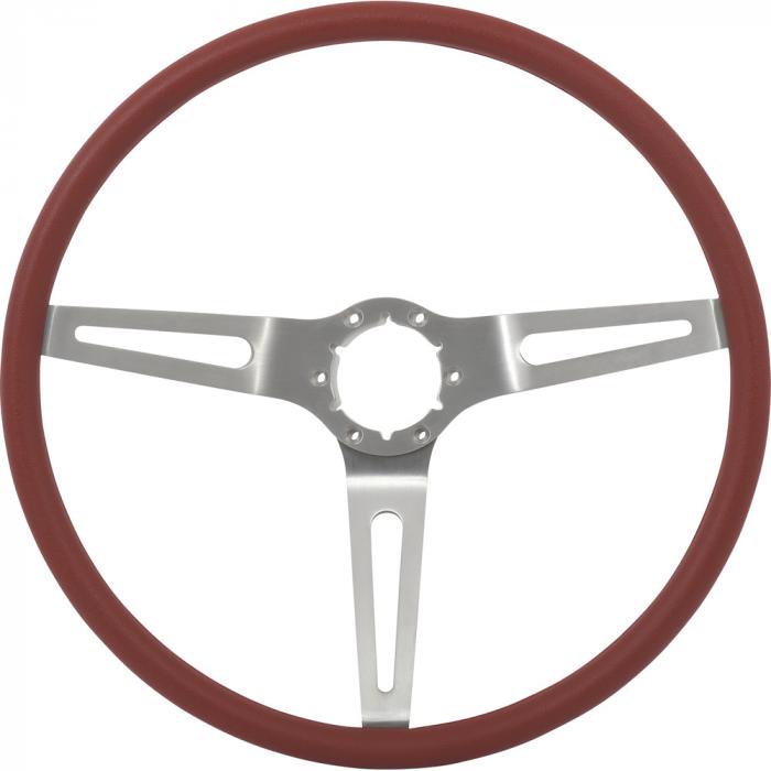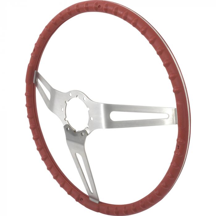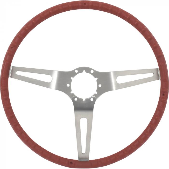 Reproduction of the original style 3 spoke cushion grip steering wheel which was optional in all 1969-70 Chevrolet full size models and widely used in a variety of other GM makes and models. Manufactured to OE specifications. Features correct slotted 3-spoke design with brushed finish stainless steel spokes and texture red grip. Chevrolet referred to this wheel as the NK1 "Cushioned Rim" steering wheel.