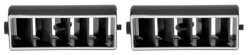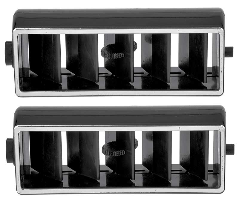Reproduction center dash air deflector vents for 1969-82 GM models with factory AC. Each vent is designed to replace broken or worn original vents. Designed just like original with curved front edge and manufactured in black with chrome trim. Sold in pairs. 1 pair required per car.