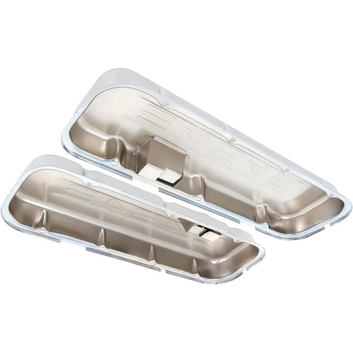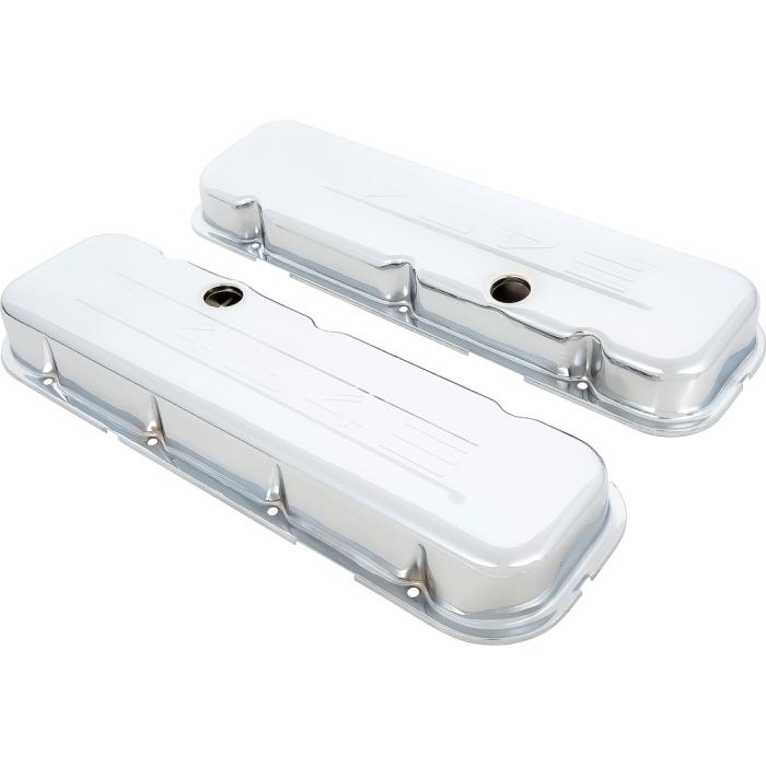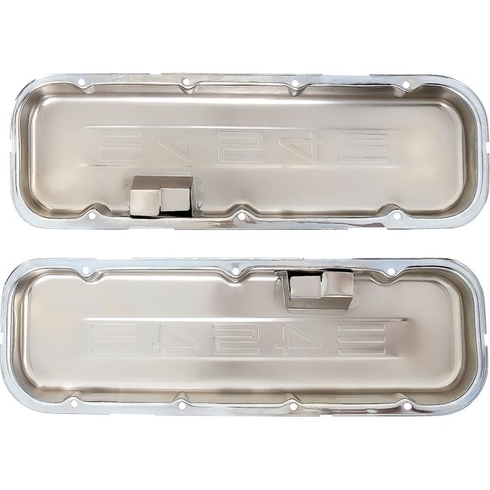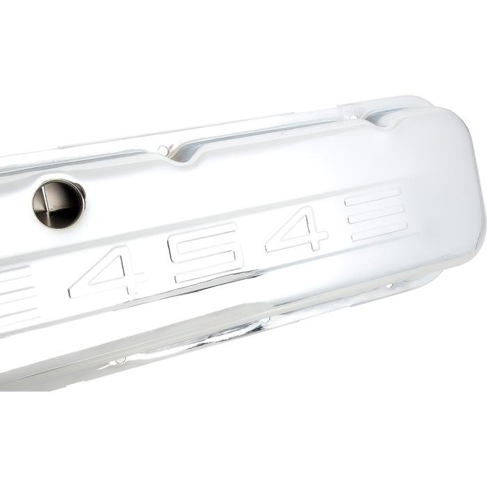 Dress-up your engine compartment with these beautiful chrome valve covers for your Chevrolet 454ci big block engine. These short profile valve covers are manufactured in quality steel featuring a highly polished chrome plating. Each set features the "454" logo directly embossed on top of each valve cover for maximum visibility.