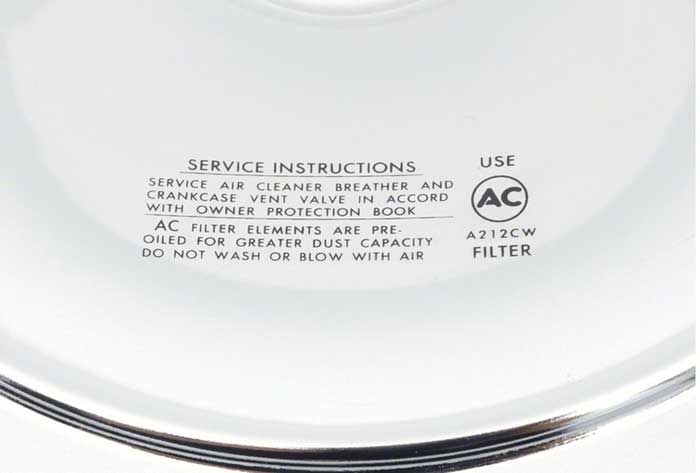 Features include "Air Filter Service Instruction" information imprinted in black on the underside of the chrome lid, in the authentic square pattern as original. Air filter element features the correct metal screen pattern, properly colored paper element, and white screen imprint with "Protect Your Engine - Replace With AC Type A212CW" markings along edge of filter as original. Correct printing and fonts are used to ensure complete accuracy and originality. The recessed base fits 5-1/8" carbureters and the filter dimensions are 14" x 3".