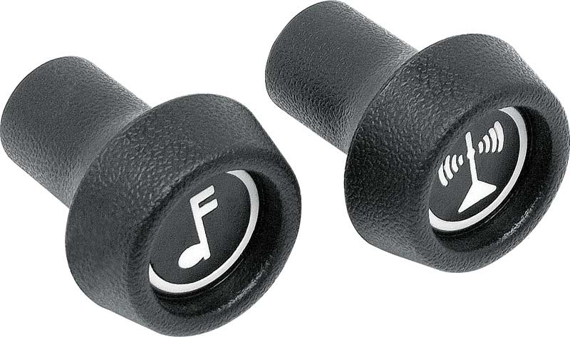 Reproduction volume and tuning control knobs for 1971-78 General Motors factory radios. Each knob features the correct radio tuning symbol and music note markings as shown. Manufactured in injection molded ABS with correct grain for authenticity. Will replace the original knob set exactly. Replaces original GM part numbers # 3986829 (tuning) & # 3986872 (volume).