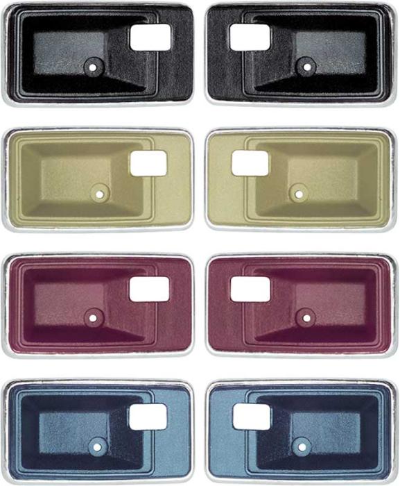 Reproduction of the original inner door handle escutcheon designed for use on 1977-81 Camaro and Firebird models. Manufactured from injection molded ABS to factory specifications that replicates the original in quality and design. The inner door handle escutcheons install in the door panel over the die-cast inner door handle assembly and snaps into place with two integral clips that are molded into the escutcheon. Escutcheons are available in black. Paint to match any interior color. Replace your worn out or missing inner door handle escutcheons with these OEM style reproductions. Sold in pairs.