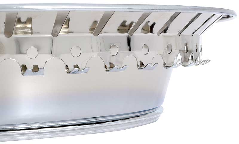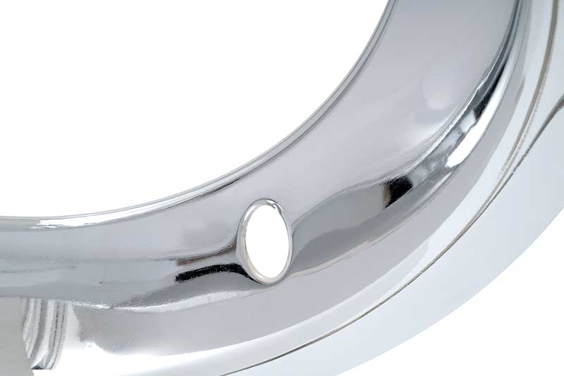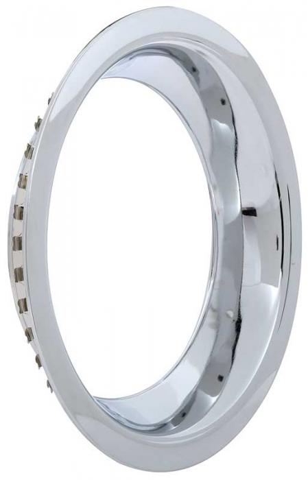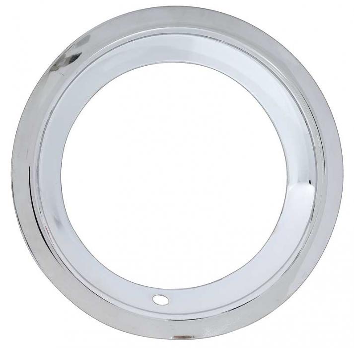 Excellent quality reproduction chrome plated wheel trim ring. Features a rounded angle design and a smooth lip. Measures 15" in diameter and 3" in width to fit most 15" Chevrolet Rally, Pontiac Rally II, and 1969-70 Chevrolet SS-style steel wheels.