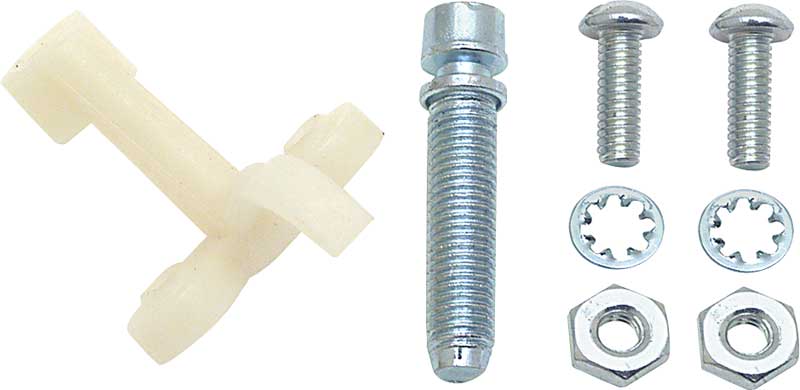 Replace damaged or missing headlamp adjusters with these quality reproductions. Each set includes 8 Pieces - (1) adjusting screw, (1) plastic adjusting nut, (2) mounting screws with (2) washers and (2) nuts. 4 sets are required for two-headlamp system, 8 sets required for 4 headlamp system (use part # B1435). Fits a wide variety of GM vehicles from 1940-65. Replaces GM part # 5949838. Includes bracket, adjuster screw and attaching hardware.