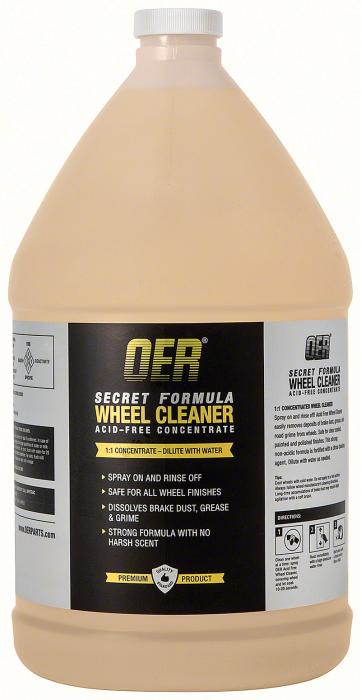 This strong non-acid formula is fortified with a citrus cleaning agent. Dilute with water according to need. Long time accumulations of brake dust may need light agitation with a soft brush. Unlike many alternative products, OER® Acid Free Wheel Cleaner dissolves grime and brake dust without damaging your chrome and alloy wheels.