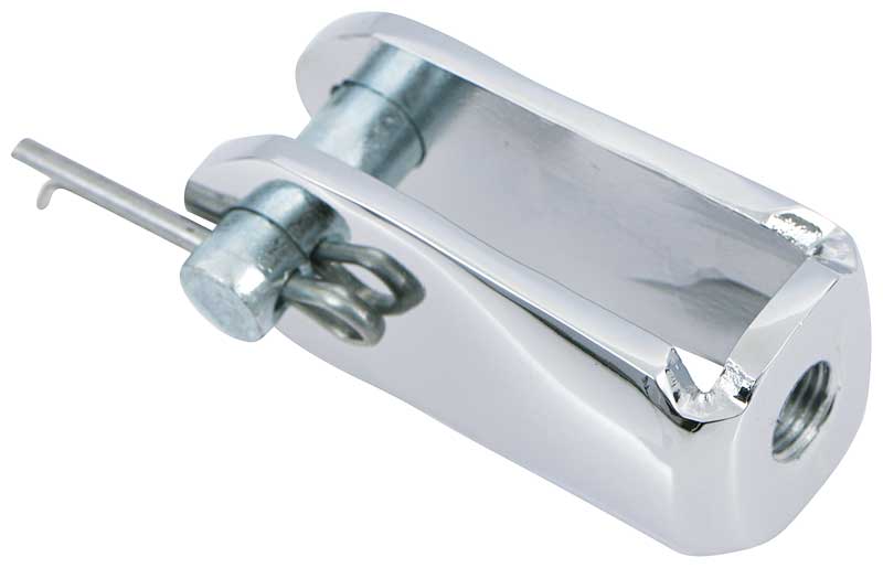 Brake pedal clevis for many potential uses, including connecting a brake master cylinder or power brake booster pushrod to the brake pedal arm. Measures approximately 2" long, is tapped for 3/8-24 fine thread, and is chrome plated to add some sparkle to your brake components. The listing indicates a variety of makes and models. This universal clevis can be adapted to most applications