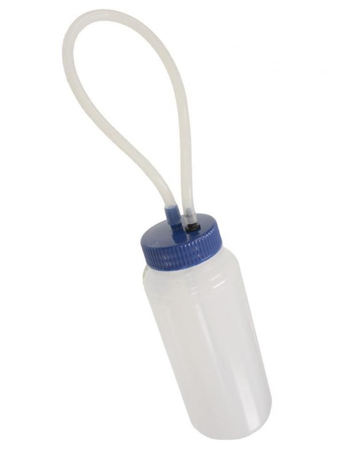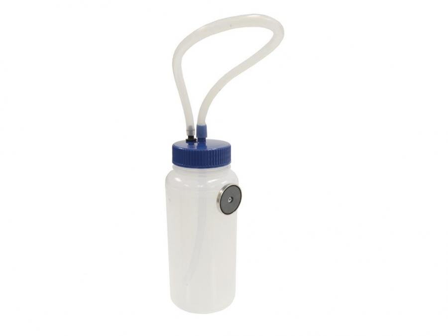 Bleed brakes without a helper! This bleeder bottle has a built-in one-way valve to let air and fluid out, but nothing back in. Simply connect the tubing to your bleeder screw and open the bleeder. When you press the pedal, old fluid and air will flow into the bottle. When you release pedal pressure, the one-way valve closes, preventing the old fluid from being sucked back into the caliper.