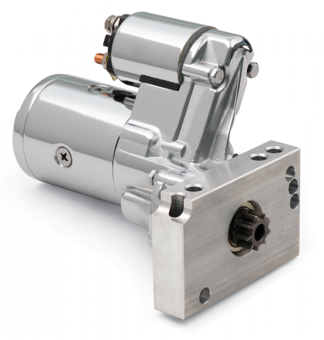 High-torque, gear-reduction design. 100% NEW, not rebuilt. Offset design results in more clearance between the oil pan and the starter, and can be rotated for additional chassis clearance. The high-torque, high-output motor spins the engine over faster than stock starters, delivering 40-50% more cranking power. 3.75-to-1 sealed gear-reduction drive and full ball bearing construction. Includes shims to set pinion-gear engagement (when necessary). Approved by all leading sanctioning organizations.