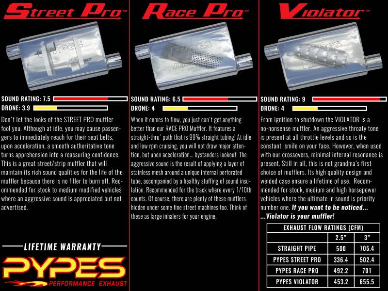 Pypes also performance matches systems with a choice of their own distinct mufflers to best suit your horsepower and sound requirements, rather than forcing you to buy one type of technology that may not be best for your application.