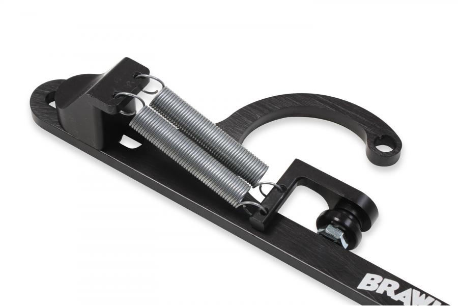 The perfect finishing touch for street rods, street machines and street/strip cars and trucks. Brawler is excited to offer throttle and fuel regulator brackets to finish your installation in style. Why go cheap on a throttle return bracket when you can get a good looking, quality piece made of billet aluminum? Let's face it, the throttle cable/return spring bracket is one of the first things your eyes focus on when you lift the hood of any car. You can't help but miss it because it's right out there in the open! If you're going the route, go the whole way with something that looks good while providing a real measure of safety. This black or clear anodized bracket is multi-adjustable to work on model 4150 and 4160 carburetors. It includes a dual return spring combination that's perched on a uniquely effective mount. Hardware is all stainless steel to stand up to the rigors of time. The Brawler name is boldly engraved and provides a very special touch to this outstanding product. For use with GM cable.