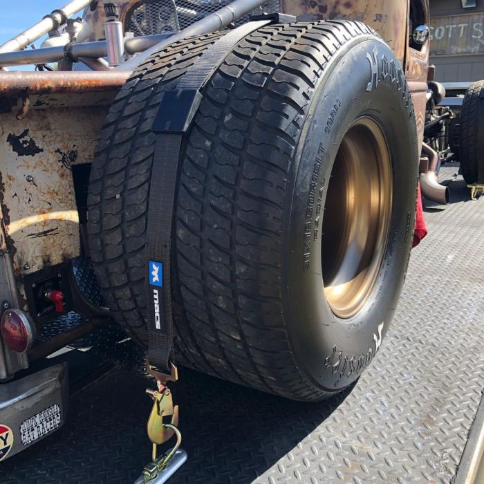 Mac's Tire Block Strap Pack provides a sleek, minimal-contact method for securing your show car for transport. Simply drape the 2" wide strap over your vehicle's tire and tighten the ratchet to compress the three molded rubber tire blocks against the tire. The tread-lock teeth on each rubber block bite into the tire's rain groove to keep the strap centered.