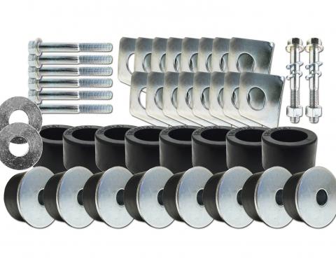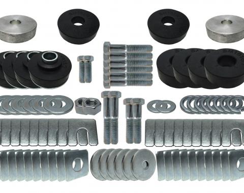 This body mounting kit contains all mounting bushings with all hardware included. It is correct S.B.R. compression molded with steel sleeve inserts. Bushing are made of high grade non recycled rubber.