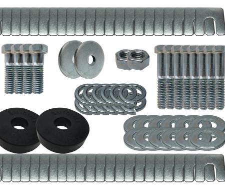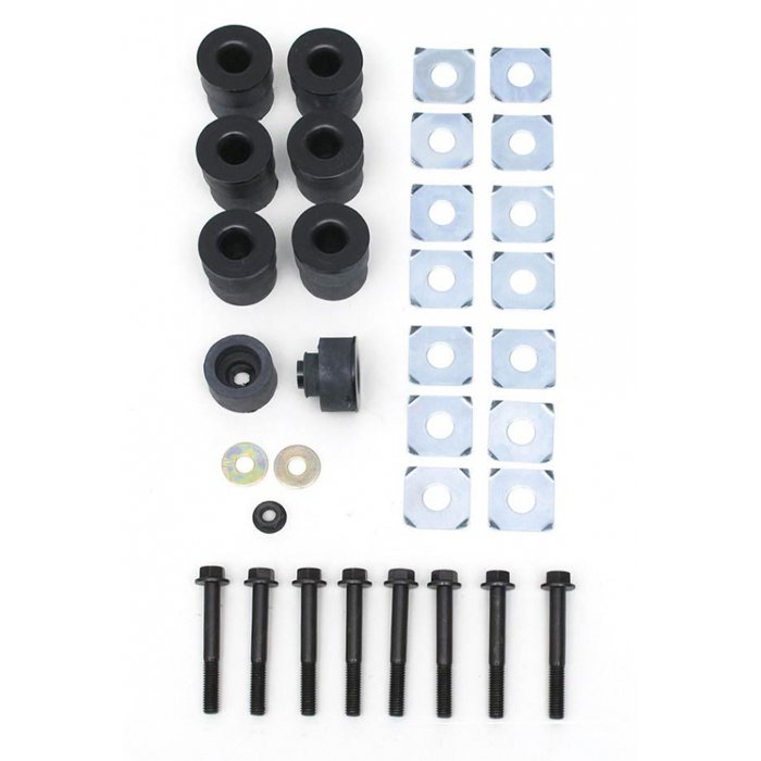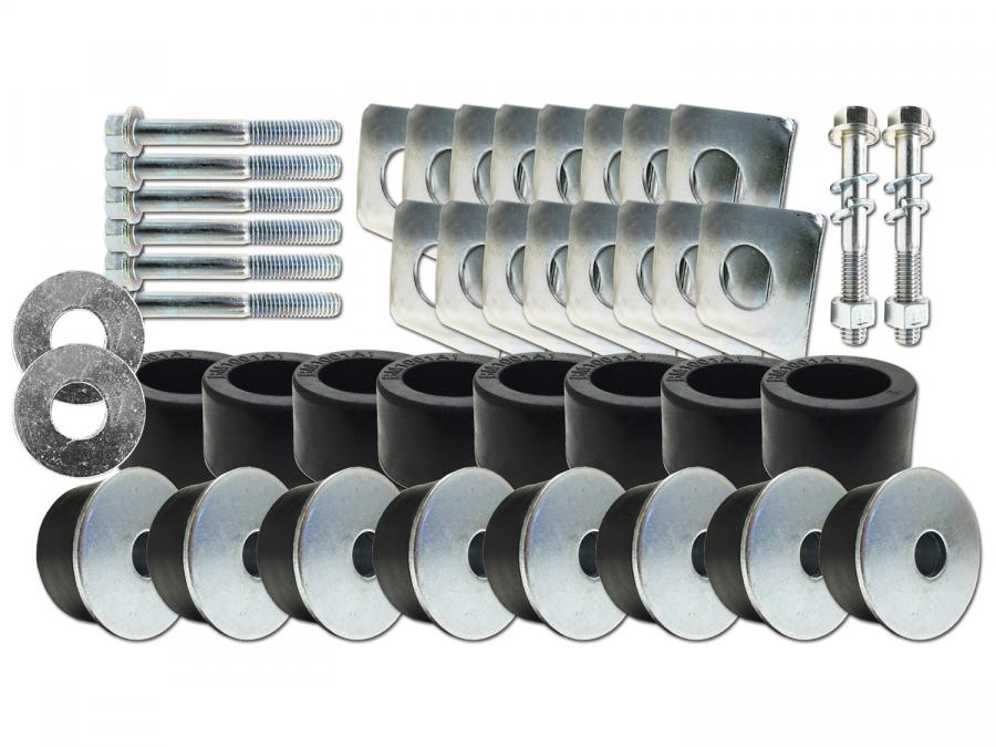 This body mounting kit contains all mounting bushings with all hardware included. It is correct S.B.R. compression molded with steel sleeve inserts. Bushing are made of high grade non recycled rubber.