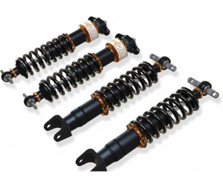 The Shark Bite coil over front spring and shock packages for 63-82 Corvettes allow for easy ride height changes without the need to disassemble the suspension. They also allow you to adjust the individual loads on each corner of the car for better, more balanced handling. The different spring rates available offer a smooth ride with great handling, unlike other bouncy front suspension conversions. Whether you have a full time race car or a street car, these shocks will provide the best performance and ride quality available. Single adjustable shocks are adjustable in rebound and compression with the easy twist of one dial. Double adjustable shocks allow for independent rebound and compression adjustments using two dials (unlike many other adjustable shocks). All shocks have 4 inches of total ride height adjustment (2" up and 2" down) and are constructed out of aluminum for lighter weight and better heat transfer. Shocks are completely rebuildable, making them lifetime components. Different spring rates are available. All springs are interchangeable, so customers can easily go with different spring rates to change the ride. Kits include the spanner wrench for ride height adjustment and also include thrust bearings to ease the adjustability. If you are price shopping, make sure other kits have these components, or you aren't comparing apples to apples. Corner hard!