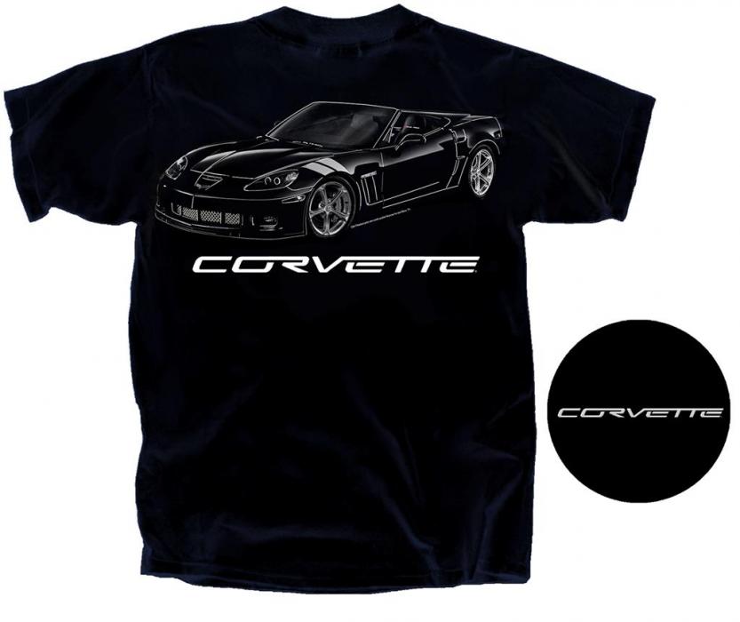Corvette black tee with small screen print Corvette Script on front left chest, large Grand Sport Corvette print on the back side.