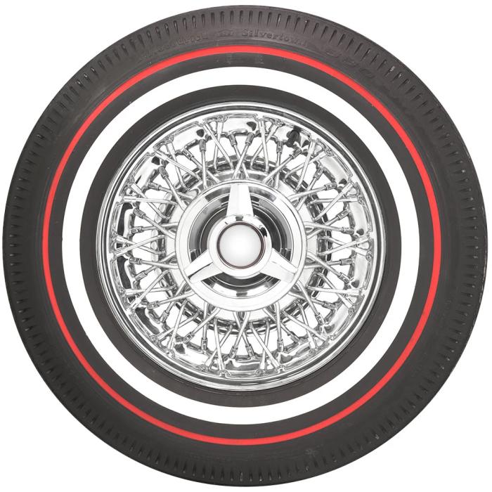 This product features a genuine redline sidewall style, sometimes known as a red stripe, due to the thin 3/8-inch strip rubber. This means that the red rubber is added directly to the tire sidewall during initial construction of the carcass, resulting in a truly integrated, high-quality product after vulcanization. Redline tires hit the American automobile market in 1964 with the introduction of the Pontiac GTO and remained a popular muscle car tire until around 1970. Dual redline tires (two red stripes) were an option on Ford Mustangs, and are now reproduced in original bias ply construction as well as radial construction.