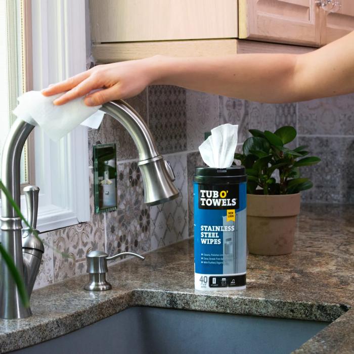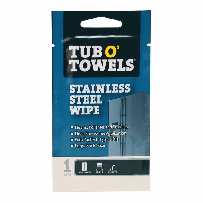 Tub O’ Towels Stainless Steel Wipes remove fingerprints, water marks, greasy stains, and soil while leaving a brilliant, streak-free shine. These stainless steel cleaning wipes will work wonders in your kitchen. Use them on your stainless steel dishwasher, range, refrigerator doors, stove top, toaster, faucet, sink and any other stainless steel appliance or surface. Great for cleaning your stainless steel grill too!