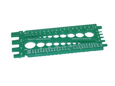 Excellent for sizing bolts, screws, nuts (USS, SAE, and Metric) and twist drills. Size bolt diameter by pushing bolt through the sizing holes. Also gauges hex nuts and washers (USS, SAE) while metric hex nuts and washers can be measured by holding them under the metric holes. The back of the gauge includes a feature for measuring US and Metric thread pitch. Special notches on the front of the tool allow you to measure flat head metal and wood screws. Made of sturdy, lightweight green plastic that resists water, alcohol, oil, and grease.