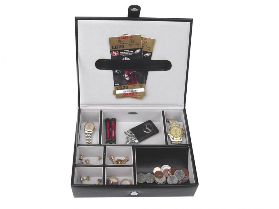 This valet/jewelry box is embellished with a beautiful brushed stainless steel Corvette emblem and has 2 padded slots for watches; in addition to 4 separate compartments for your rings and cufflinks, a coin slide, and a slim storage strap in the lid for photos. The lid snaps tight so your valuables will not be disturbed.