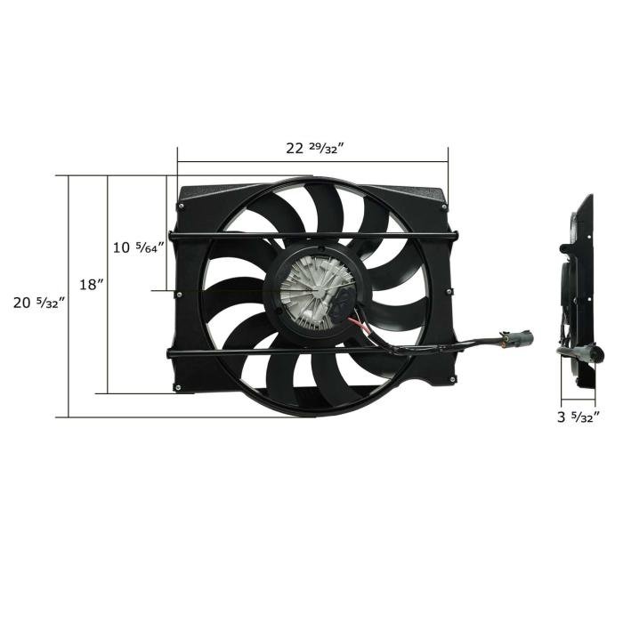 Brushless electric fan with custom shroud and powder coated tubular mounting bracket (see diagram for dimensions and clearance requirements). Includes heavy-duty 6-gauge power harness wiring kit with 100 amp MIDI-fuse assembly.