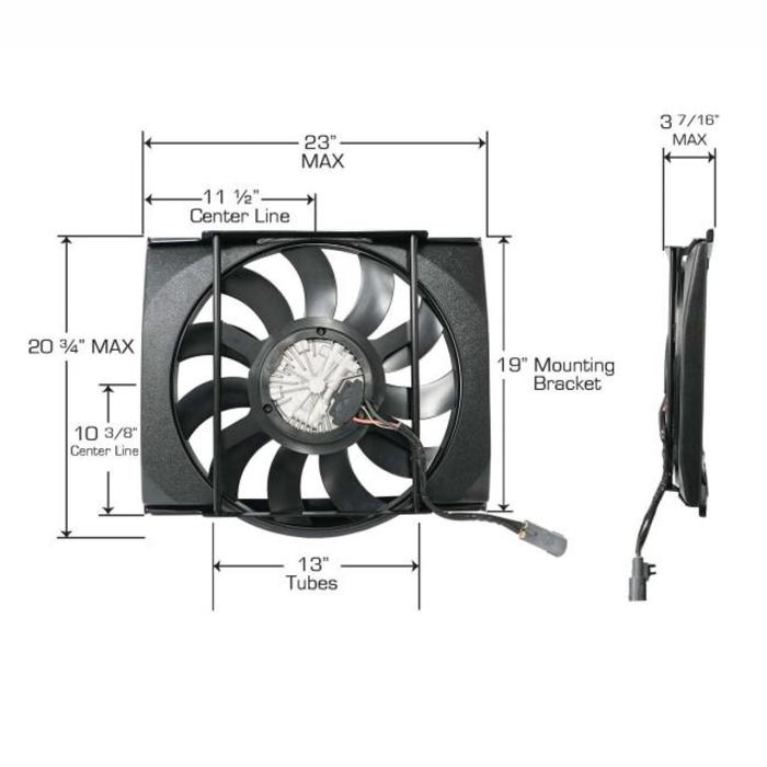 Brushless electric fan with custom shroud and powder coated tubular mounting bracket (see diagram for dimensions and clearance requirements). Mount vertically or horizontally. Includes heavy-duty 6-gauge power harness wiring kit with 100 amp MIDI fuse assembly.