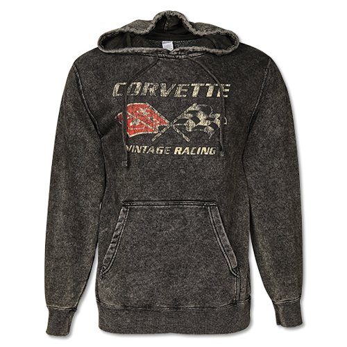 Vintage Corvette Racing Stone Washed Hoodie 80/20 cotton/polyester 9 oz. Ring spun cotton, jersey lined hood, and ribbing cuffs and waistband with a vintage, distressed print.