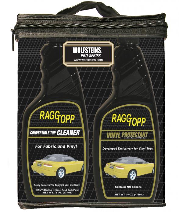 RAGGTOPP Vinyl Convertible Care Kit contains one bottle of RAGGTOPP Cleaner and one bottle of RAGGTOPP Vinyl Protectant for safely cleaning and protecting your vinyl convertible tops per manufacturer's recommendation.One Bottle of RAGGTOPP Fabric/Vinyl CleanerOne Bottle of RAGGTOPP Vinyl Protectant