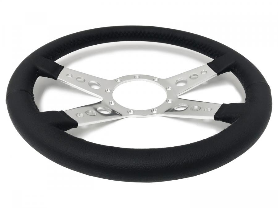 S9 steering wheel series come in premium leather grip option with polished aluminum anodized center finish. They feature a 14 in. diameter with a 2 in. depth for turn signal clearance. The grip thickness is 1.25 in.