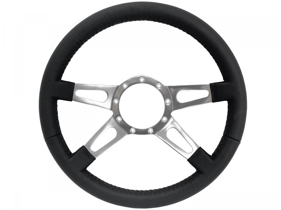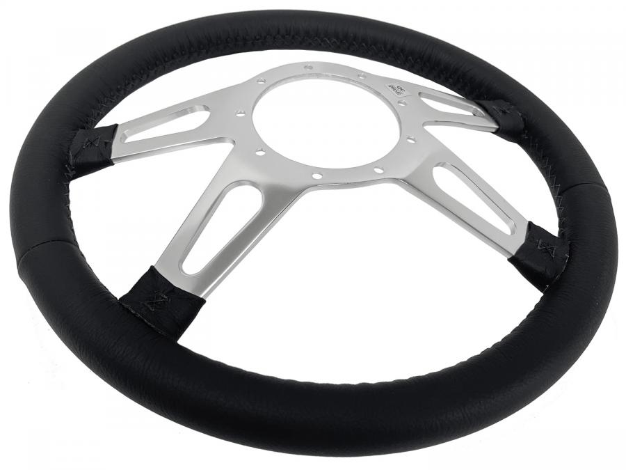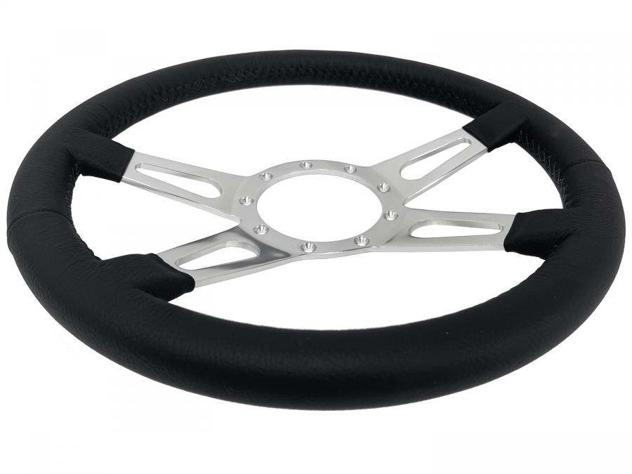 S9 steering wheel series come in premium leather grip option with polished aluminum anodized center finish. They feature a 14 in. diameter with a 2 in. depth for turn signal clearance. The grip thickness is 1.25 in.