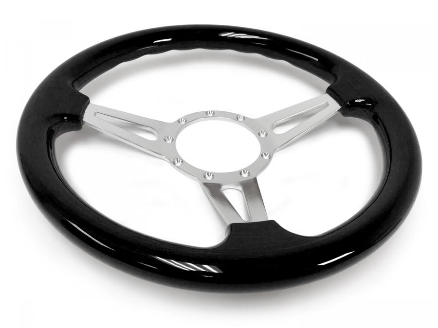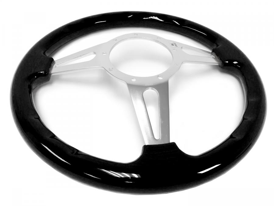 S9 steering wheel series come in real black ash finish wood grip option with polished aluminum anodized center finish. They feature a 14 in. diameter with a 2 in. depth for turn signal clearance. The grip thickness is 1.25 in.
