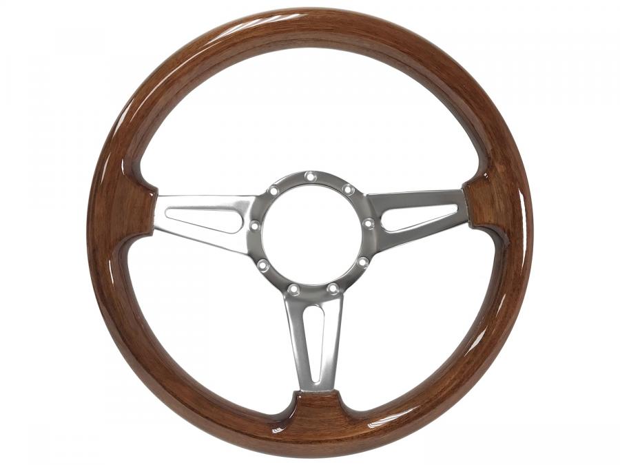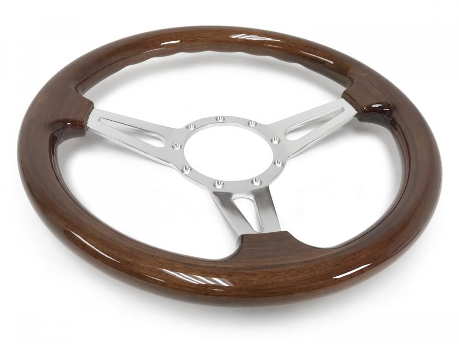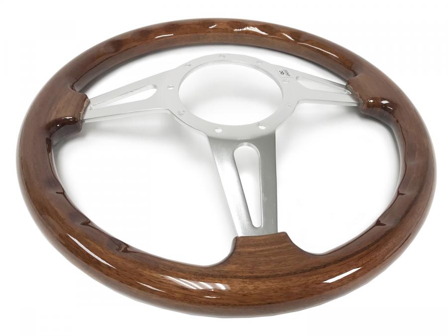 S9 steering wheel series come in real walnut finish wood grip option with polished aluminum anodized center finish. They feature a 14 in. diameter with a 2 in. depth for turn signal clearance. The grip thickness is 1.25 in.