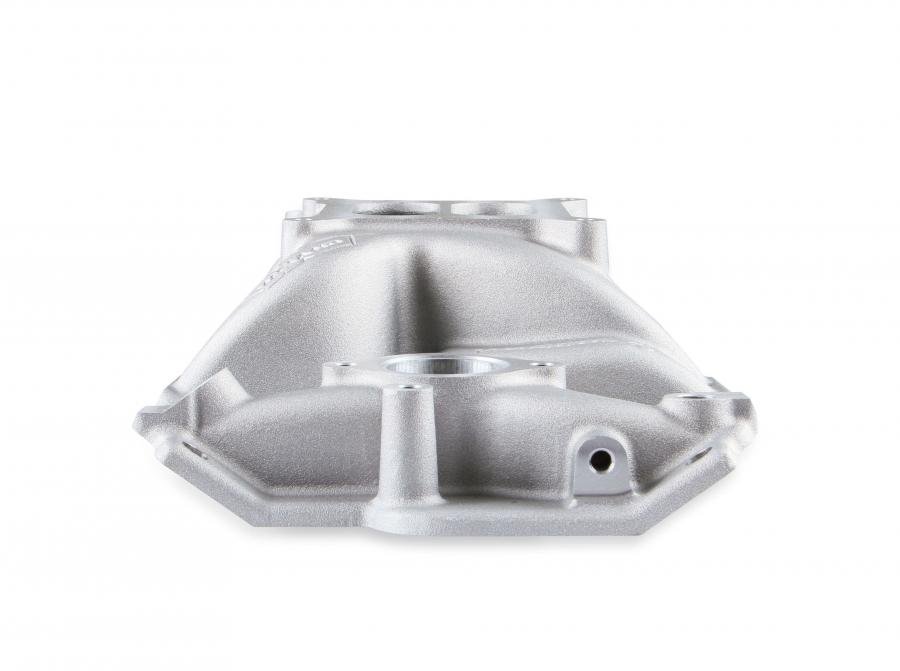 Utilizes late model alternator an A/C bracket mounting provisions. Has additional vacuum tap off of runner. Recommended intake manifold gasket - Mr Gasket #'s 5821 or 101G Plenum depth: From the carb flange to the bottom of the upper plenum is 2-3/16". To the bottom of the lower plenum is 4-1/16".