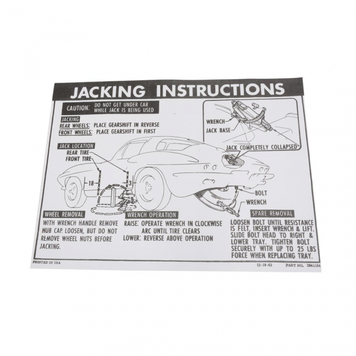 Corvette Decal, Jacking Instructions with 36 Gallon Tank, 1963-1966