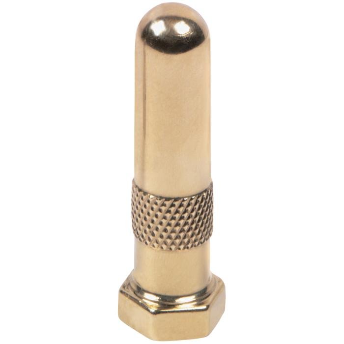 This brass dust cover for rubber stem valves bring period correct style to early vehicles. Brass valve stem covers and dust caps for cars are excellent detail accessories for restored cars and trucks. This polished brass cover for rubber stem vales is designed specifically to fit over TR135 rubber valve stems. Cover is approximately 2 1/2 inches in length.