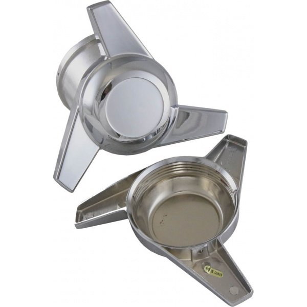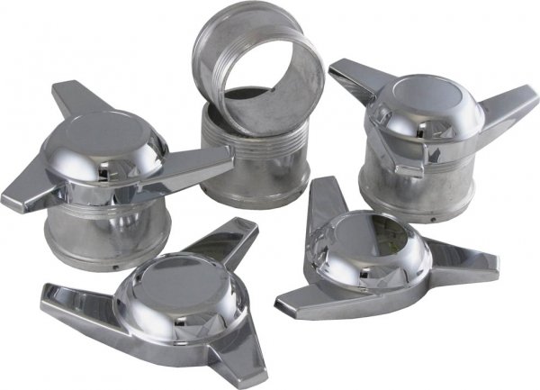 Spinner kits will fit all 1976-82 stock aluminum wheels or any wheel with a 3-1/4" center hole. Spinners are triple chrome plated and adapters are die-cast aluminum. Kits include spinners, adapters, Allen set screws and wrench. Choice of 1-3/4" emblems must be ordered separately. Optional polished aluminum cones enhance the wheels appearance by covering the lug nuts. Cones are held in place by the spinners.